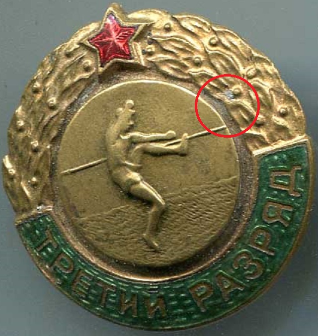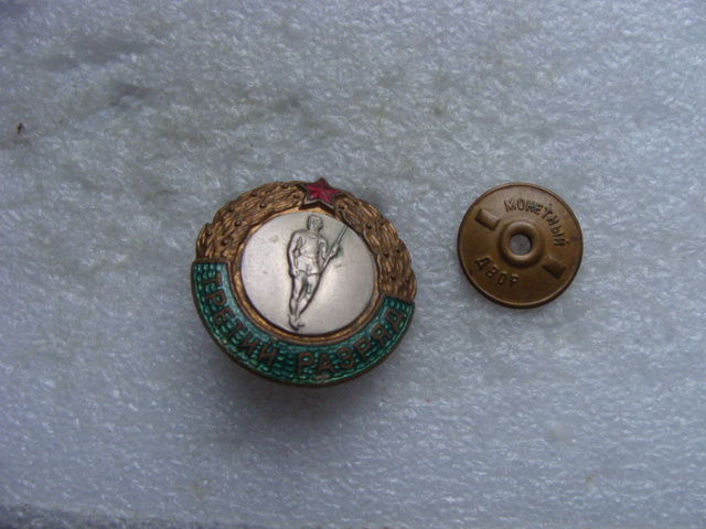 Уважаемые коллеги! Это заблуждение, присмотритесь внимательно к знаку ПРЫЖКИ В ВЫСОТУ - небрежные остатки припоя, это свидетельство переделки - замены медальона, диаметр его намного меньше штатных таблеток разрядников, он более плоский