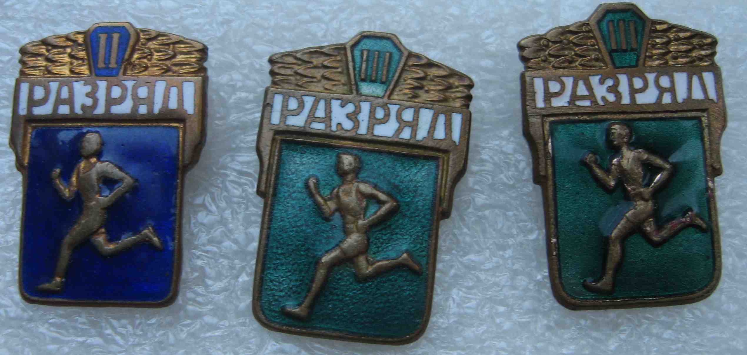 Бегунки-были первыми(прототип ГТОошника)...В 50-х,появились-круглые,которые,были заменены на "квадратные",3-й и 2-й(те же бегунки)1-й разряд-видоваой"приямоугольный...Первые несколько лет выпускались-на тяжёлом метале....В начале 60-х,стали шлёпать,из аллюминия...