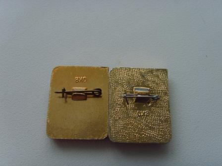 А что тут сказать? Слева ВХО и справа ВХО (только клеймо "зеркальное"). Слева гладкий реверс и латунная застежка, справа не гладкий реверс и стальная застежка. Левый знак по размерам немного меньше, чем правый. Это ВХО-шные знаки, просто разных форматов. Слева более ранний, справа поздний. А вообще среди ВХО-шных разрядников выделяю (для себя) четыре формата с характерными признаками, которые и собираю отдельно.