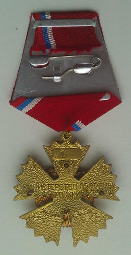 № 1, Министерство обороны России - тяжёлый металл, смола, накладка, колодка с матерчатой лентой, булавка. Размах крыльев орла: 39 мм.