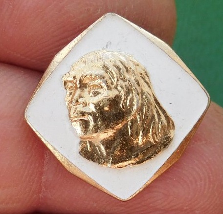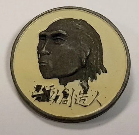 На значке — Синантроп (лат. Homo erectus pekinensis — «человек прямоходящий пекинский»)