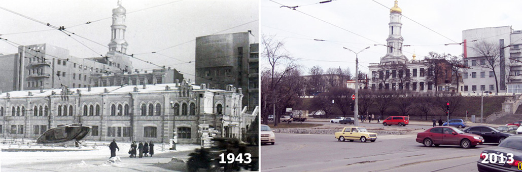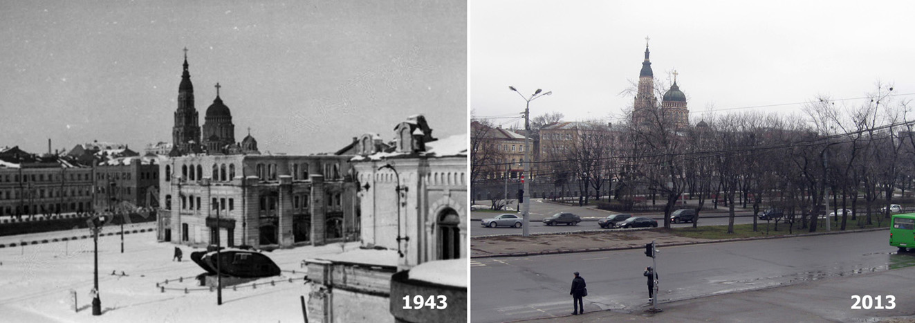 Вот два снимка сделанные в Харькове, на Пролетарской площади, с интервалом в 70 лет. Ориентиром являются купола Благовещенского собора.