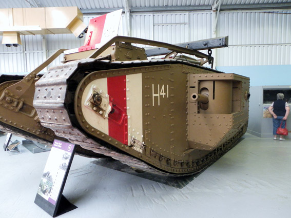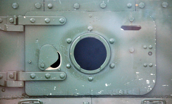 Прямо над беретом крайней правой женщины - ствол орудия. Чуть правее вертикальная черная полоса - смотровая щель башни. Над башней один ряд заклепок. Снизу два ряда заклепок.