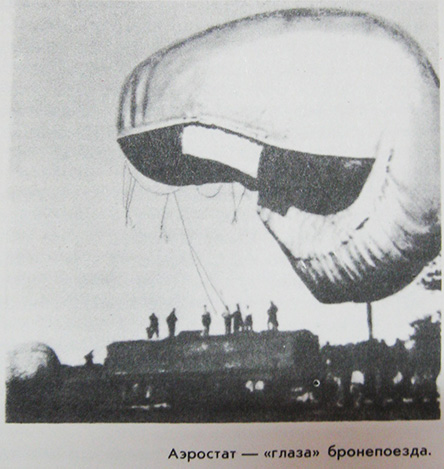 «Весьма действенным являлось использование аэростата, который называли глазами бронепоезда. В период гражданской войны бронепоезда Красной Армии использовали в основном два вида привязных змейковых аэростатов: немецкой системы «Парсеваль» и французской — «Како». Аэростаты были снабжены спасательными парашютами для наблюдателей, телефонным аппаратом, сигнальным рупором на случай выхода из строя телефона, мешком с балластом, анероидом, часами с секундомером, биноклем или зрительной трубой, а также топографическими картами. Аэростаты обычно устанавливались на специальной платформе и поднимались за 5—10 км от линии фронта. В зависимости от метеорологических условий и оптических приборов с аэростата местность просматривалась в радиусе 50—60 км.