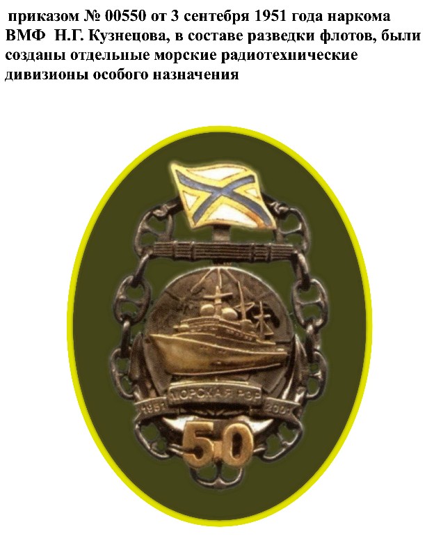 2. Но есть еще приказ № 00550 от 3 сентебря 1951 года наркома ВМФ Н.Г. Кузнецова, об учреждении в составе разведупров флотов отдельных морских радиотехнических дивизионов особого назначения