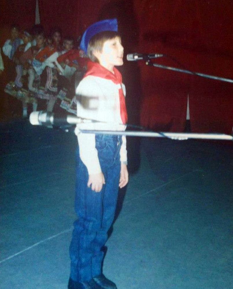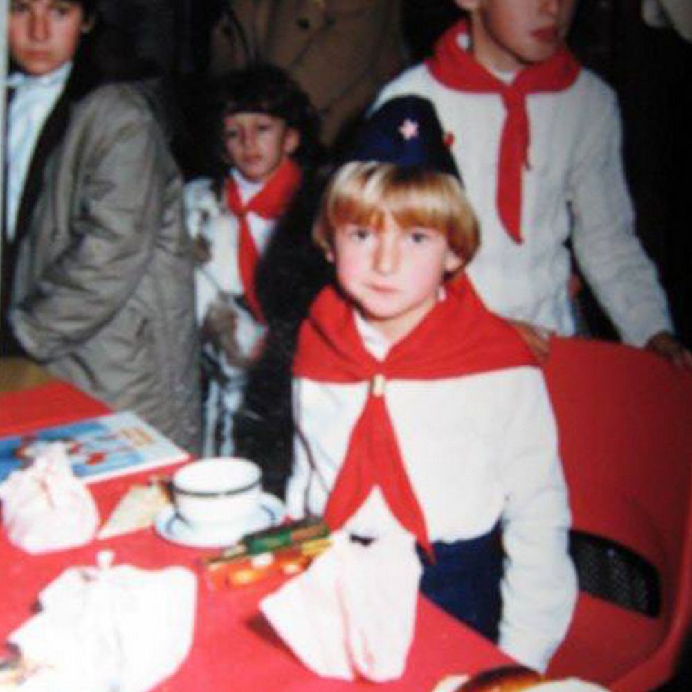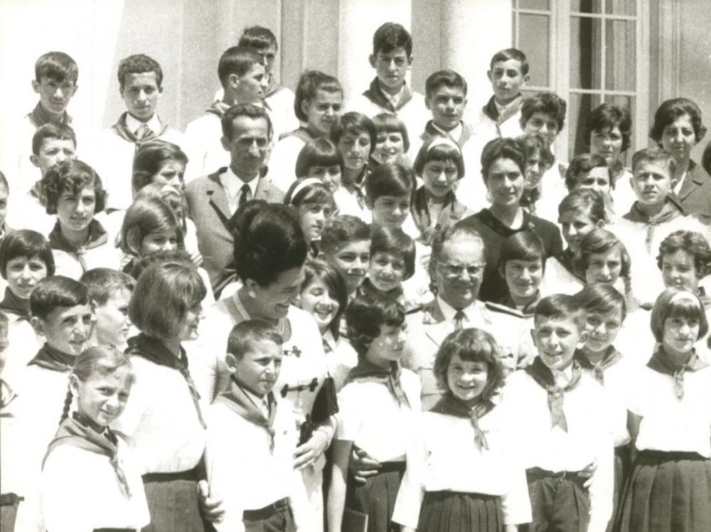 Пионеры Белграда отмечали юбилей организации.Длинноволосый пионер в галстуке с лавровым венком на голове.