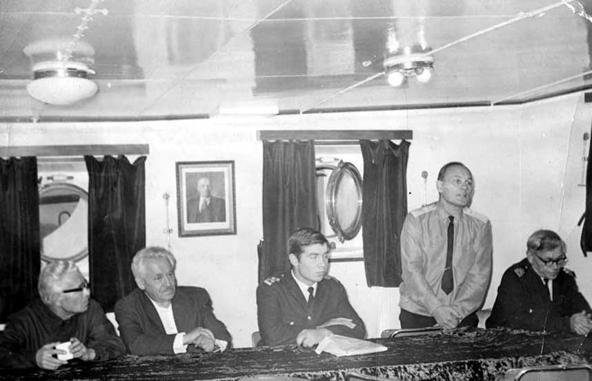 В Буэнос-Айресе на судно пришел старый слесарь-железнодорожник Немцов. Сейчас ему уже за 80 лет, он эмигрировал из царской России. Когда он узнал, что я один из участников плавания в Аргентину на парусном учебном судне «Товарищ» в 1926 году, он подарил мне небольшую жестяную пластинку ? трафарет серпа и молота, через которую на 500 красных флажках была нанесена наша эмблема. С этими флажками железнодорожники и другие рабочие встречали нас на причале. Немцов трафарет сделал собственноручно, и, по его словам, эта пластинка ? самое дорогое для него. Вручая её мне, он просил передать свой поклон Родине и Воронежской области, откуда он родом. Пластинка передана в Арктический музей.