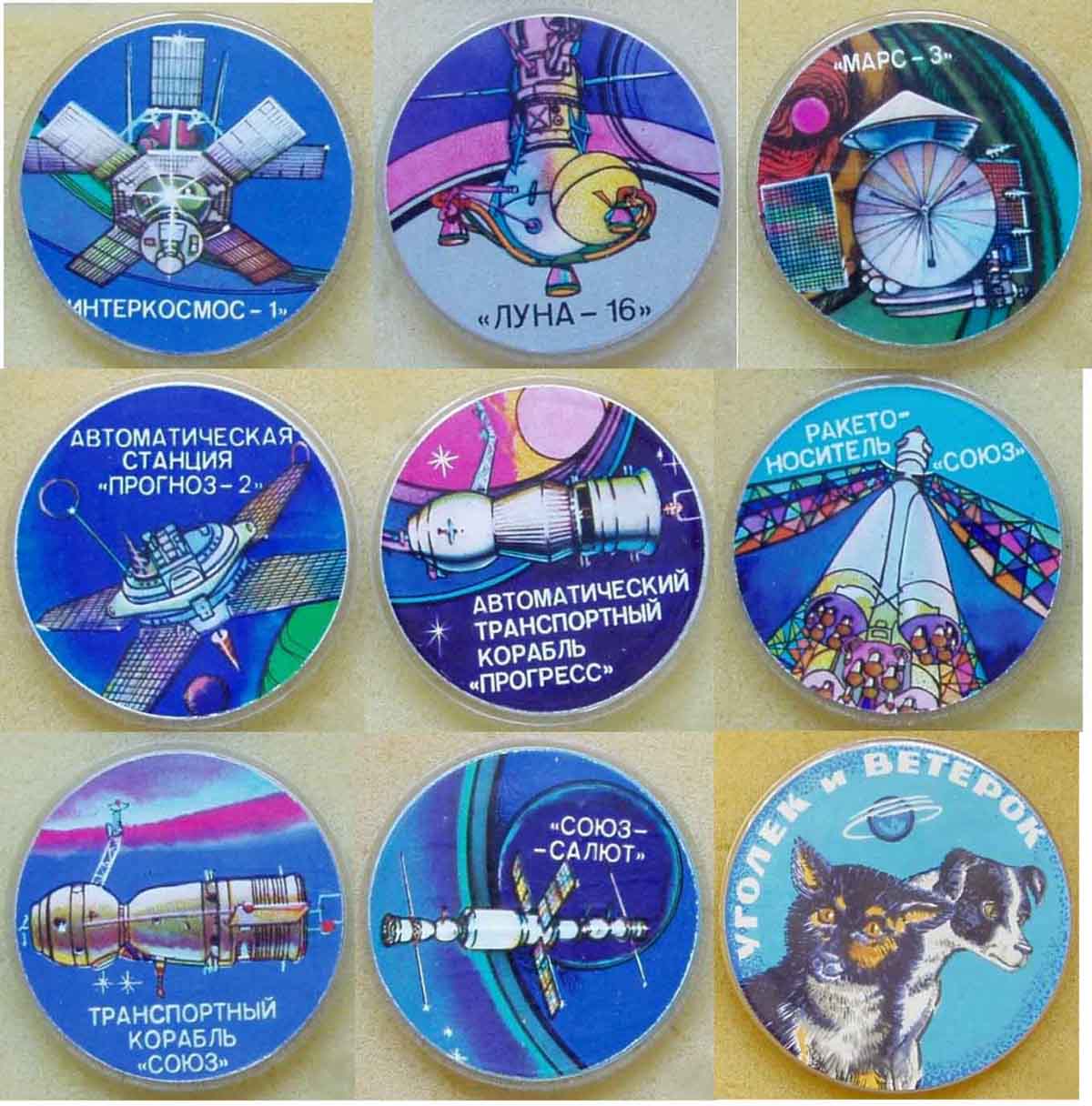 XVI.62. Квадрат со стороной 15 мм. На каждом значке изображен космический аппарат с пояснительной надписью.