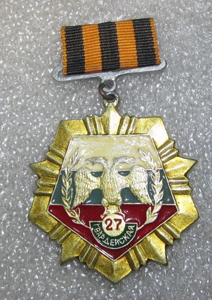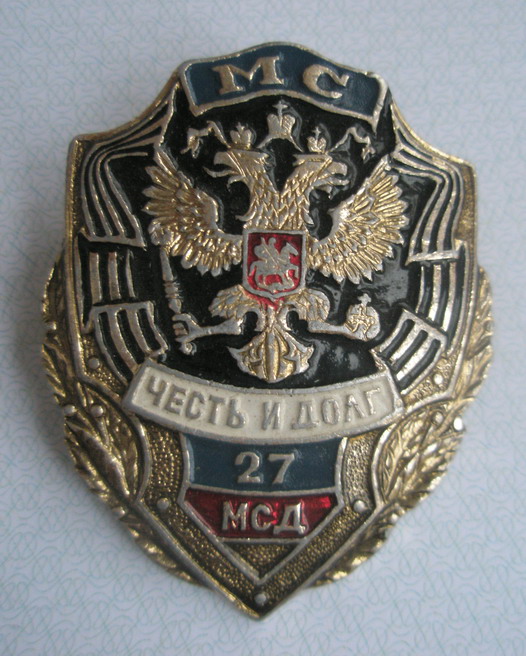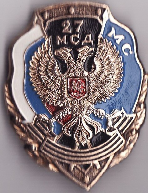 27 мсд - это Дивизия Миротворческих Сил, базируется в Тоцком Оренбургской области. Состоит из мотострелковых полков, а также танкового и артиллерийского, каждый полк имеет свой отличительный знак с номером полка. У Николая в теме размещены пару знаков, постараюсь ещё ему подкинуть, но к сожалению в связи с военной реформой 27 мсд преобразована в 21 омсбр