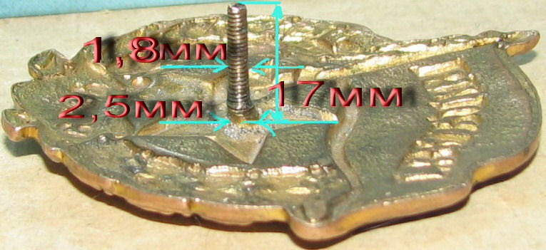 У меня есть вот такая Гвардия. Размер 46,8х36мм. Высота винта 17мм, диаметр 1,8мм. Отверстие у гайки диметром 1,9 мм. Резьба была провалена, напаяли гайку соответствующего диаметра. (гайка отвалилась, следы припоя остались).Как я понял из прочитанных постов,артельные знаки , практически не описаны. Есть мнение, что с такой резьбой, 1,8 мм , а у основания 2,5 см, эта Гвардия одна из первых?