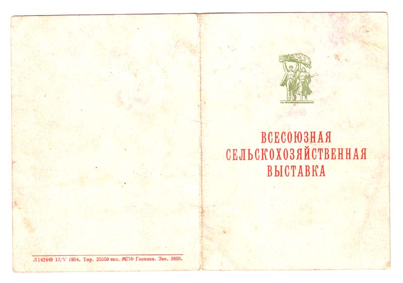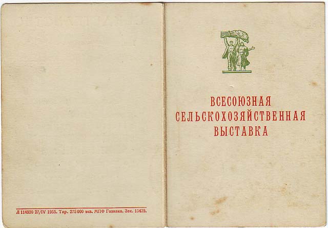 Вот, на мой взгляд, интересный документ-"времянка". Медали "За успехи.." с удостоверением, (в отличии от свидетельства участника) если проследить по документам, вручались как правило в следующем году после проведения выставки.(зимой, в некоторых случаях весной). "Времянка" была подтверждением для трудового коллектива, что участник выставки занял призовое место в номинации. :)