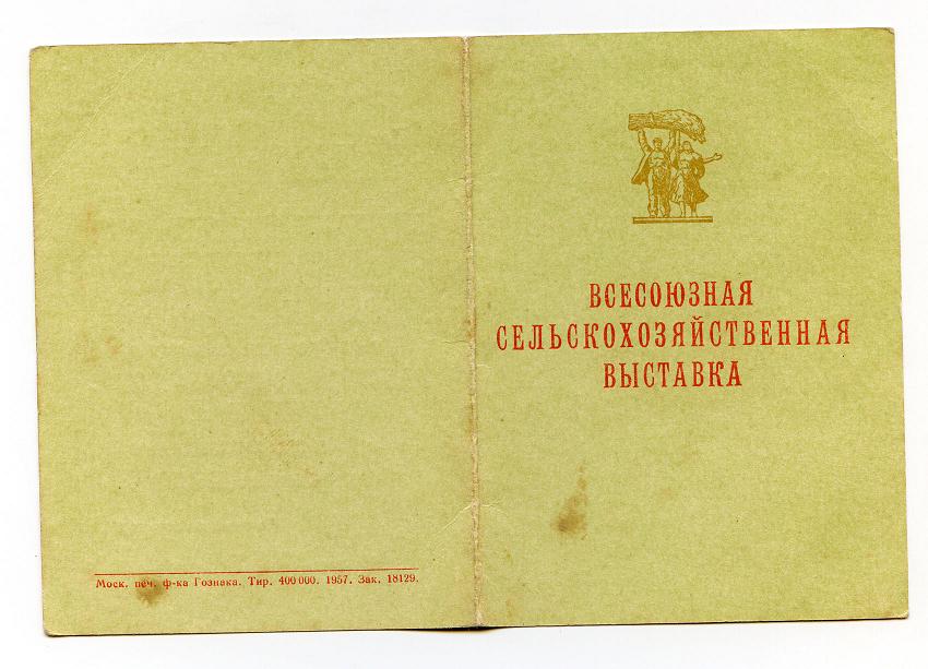 Если, точно употреблять термины, то это не удостоверение , а свидетельство участника выставки. Удостоверение вручалось с медалью: "Победителю соц. сор.", "За успехи..."