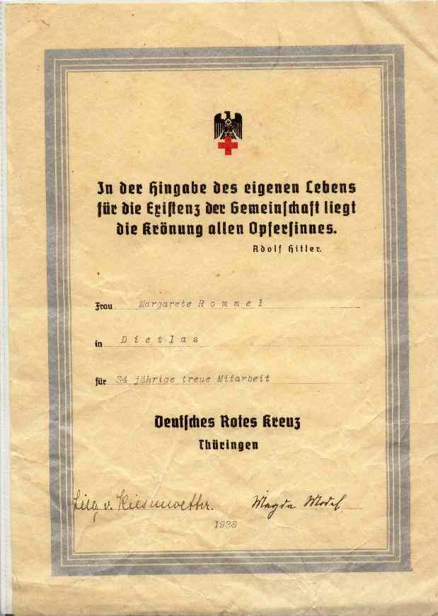 А вот такая грамота от немецкого красного креста за 34 года безупречной работы.