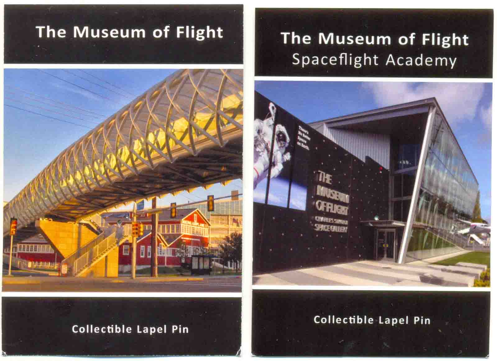 Два значка и этикетки к ним из аэрокосмического музея (The Museum of Flight, Музей Полетов) в Сиэтле.