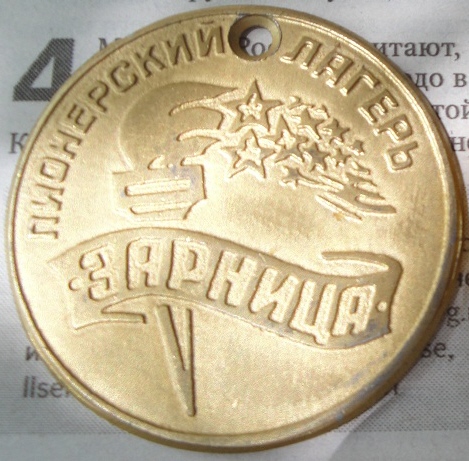 самопальный вкладыш в знак-пуговицу (опубликован бывшим пионером) и современный знак по этому вкладышу, выпущенный, возможно, к встрече пионеров этого лагеря