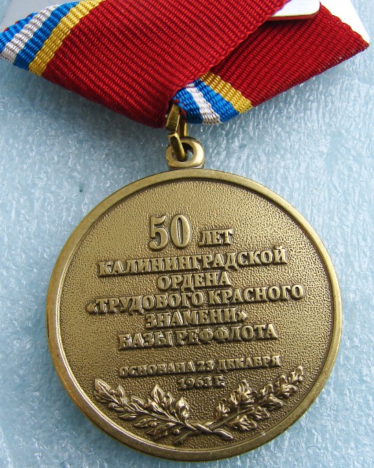Реверс медали, сообщающий что она выпущена по случаю 50-летия Калининградской базы рефрижераторного флота