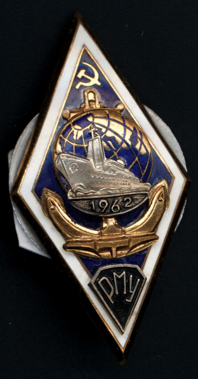 И стиль и техника изготовления. У них есть и другие, более ранние (1960...) значки, выполненные без окантовки белой эмалью по краю, и накладным секстантом (или винтом), а по тем я точно знаю, что они выдавались выпускникам Рижского мореходного училища. На моем аналогичном первому, почему то земной шарик покрыт белой эмалью.