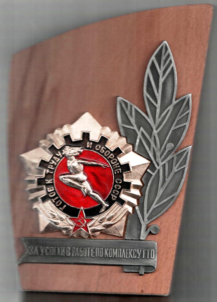 "Почетный знак ГТО". Размер 215х145. Для награждения коллективов физической культуры и спортивных клубов. Учрежден постановлением Комитета по физической культуре и спорту при Совете Министров СССР в июне 1973 г. в целях поощрения коллективов физической культуры и спортивных клубов, добившихся высоких показателей в работе по внедрению комплекса ГТО. Знак вручался Комитетом по физической культуре и спорту при Совете Министров СССР по представлению комитетов союзных республик, городов Москвы и Ленинграда и Центральных советов спортивных обществ "Динамо" и "Зенит".