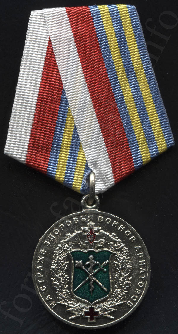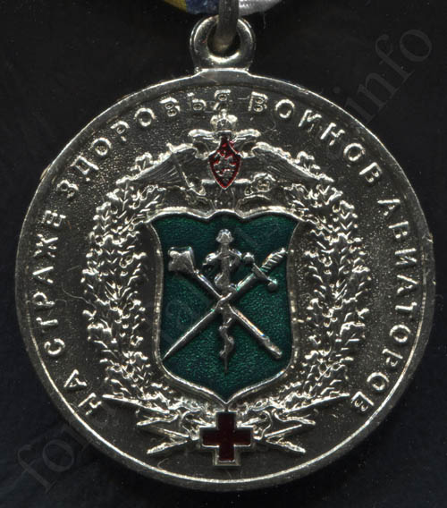 На лицевой стороне медали изображен герб Главного центра государственного санитарно-эпидемиологического надзора Министерства обороны (ГЦ ГСЭН МО РФ). Причем герб старый - с изображением алебард, указывающих на подчиненность или принадлежность к Тылу ВС РФ. Медицинская служба ВС РФ была выведена из состава Тыла ВС РФ и стала самостоятельной ровно 10 лет назад - в августе 2004 г. с тех пор на официальных гербах военно-медицинских частей и учреждений ВС РФ алебарды не используются.