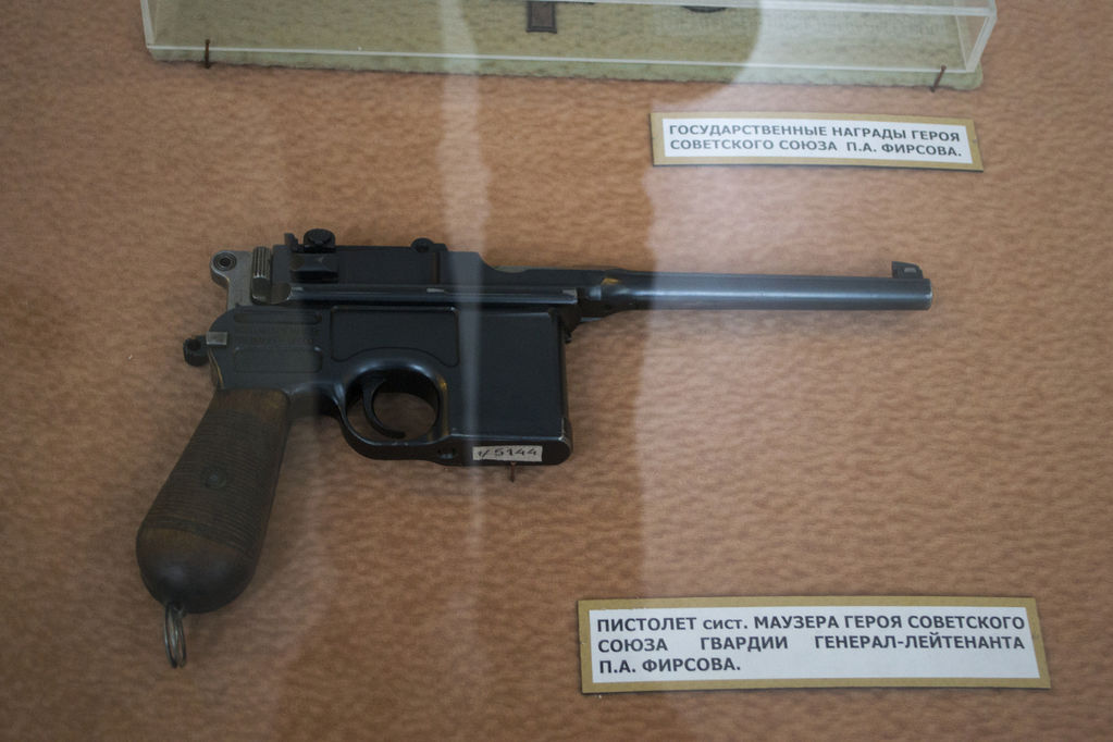 В качестве личного оружия Сталин обычно использовал Маузер модель 1910/1914. Для своего времени это был отличный выбор – при весе 475 г пистолет имел магазин на девять патронов вместо о6ычных для карманных пистолетов шести, а пуля калибра 6,35 мм с 17 метров пробивала пять дюймовых сосновых досок (Наган пробивал только три). Но, в отличие от руководителей Третьего рейха, Сталин не любил украшений на оружии. Большинство его личных пистолетов не имели даже именных табличек, не то что позолоты и гравировки со всечкой. Вот, например, тот самый Маузер М1914, выставленный в ЦМВС: