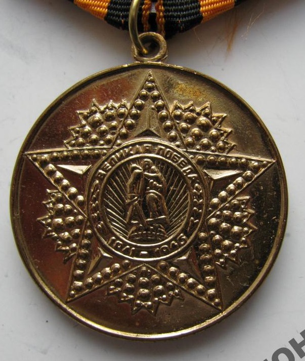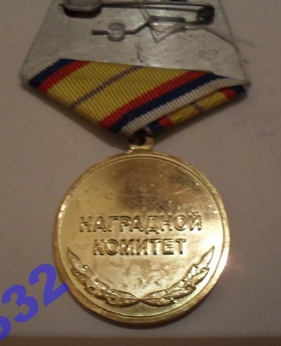 Медаль при помощи ушка и кольца соединяется с золотистой четырехугольной колодкой, обтянутой бело-сине-красной шелковой муаровой лентой.