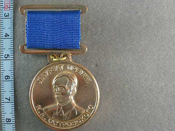 Медаль представляет собой золотистый круг, диаметром 32 мм. На аверсе (лицевой стороне) помещено изображение портрета Н.А. Островского и надпись – в верхней части: «Лауреат премии»; в нижней части – «Н.А. Островского».