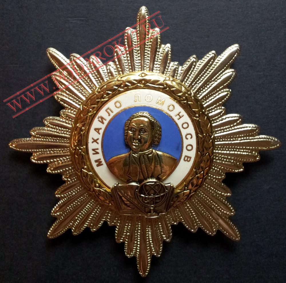Орден Михайло Ломоносов - представляет собой серебристую многолучевую восьмиконечную звезду. В центре звезды расположен синий круглый медальон с портретом Михайло Ломоносова, по белому канту надпись: «МИХАЙЛО ЛОМОНОСОВ». Медальон обрамлен золотистым лавровым венком. В нижней части медальона помещена серебристая раскрытая книга, перо и глобус.