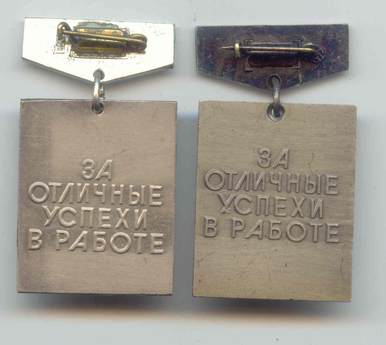 Появилась разновидность - разные штампы оборотной стороны: на плашках клеймо ММД различается своим видом; на втором знаке надпись "За отличные успехи в работе" заметно приподнята.