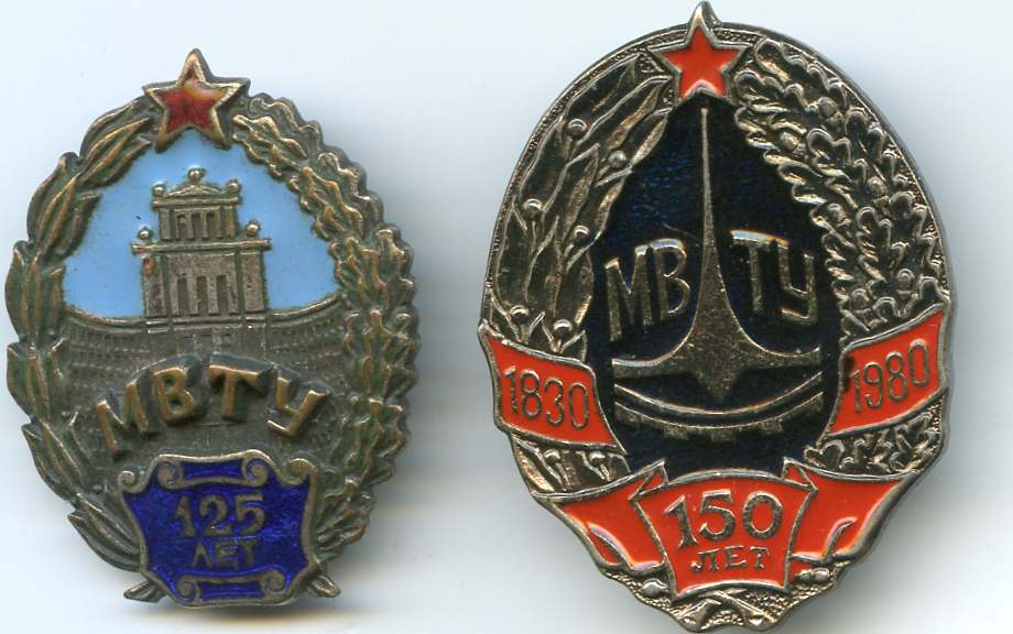 Знаки в честь 125-ти и 150-ти летия МВТУ. Тяжелый металл. Высота 37 мм.