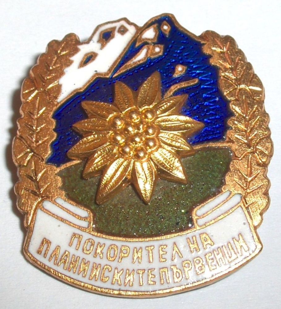 Значок болгарских туристов-альпинистов. Буквальный перевод - Покорителю самых высоких вершин в Болгарии. Цветок-эделвейс. Встречается часто,в разных вариантах - не дорогой.рок писал(а) :К чему посвящен знак? Переведите надпись, если можно...