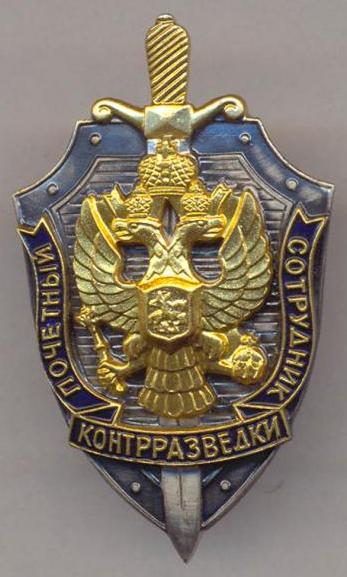 Нагрудный знак "Почетный сотрудник контрразведки" учрежден Приказом ФСБ от 22 марта 1994 года. Им награждали за особые заслуги в оперативно-служебной деятельности и проявленные при этом инициативу и настойчивость. Изготовитель - ММД.