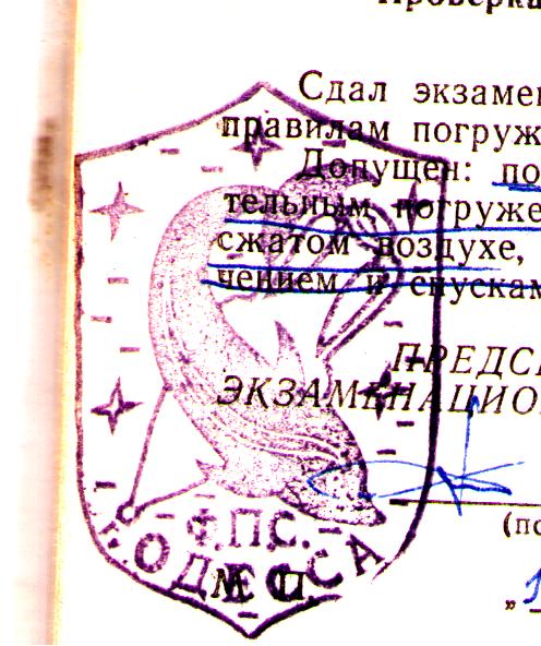 С удостоверением выдавался, всё-таки, знак ПОДВОДНЫЙ ПЛОВЕЦ. Он первый в теме. Во всяком случае так было в СТК "Дельфин" (Москва)
