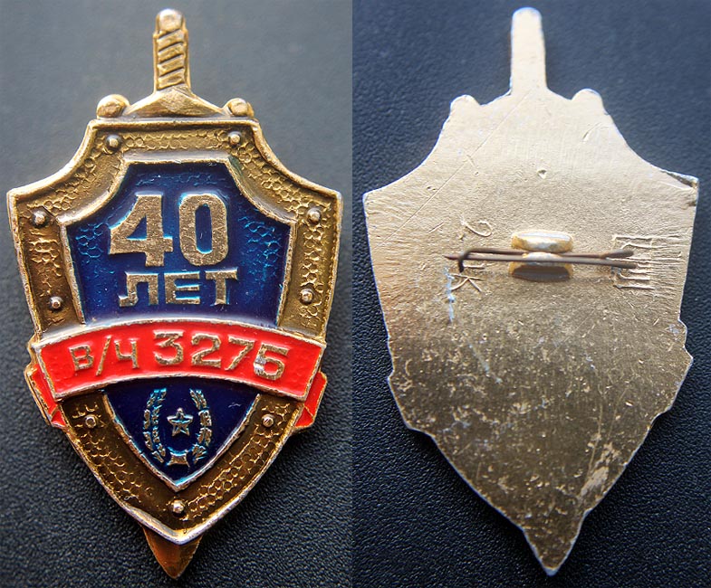 На самом деле, это знак 40 лет в/ч 3275 ВВ МВД СССР (г.Лесной, Свердловская область).viktory-ok писал(а) :В/ч 3276 внутренних войск, г.Глазов (Удмуртия)