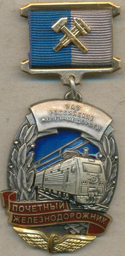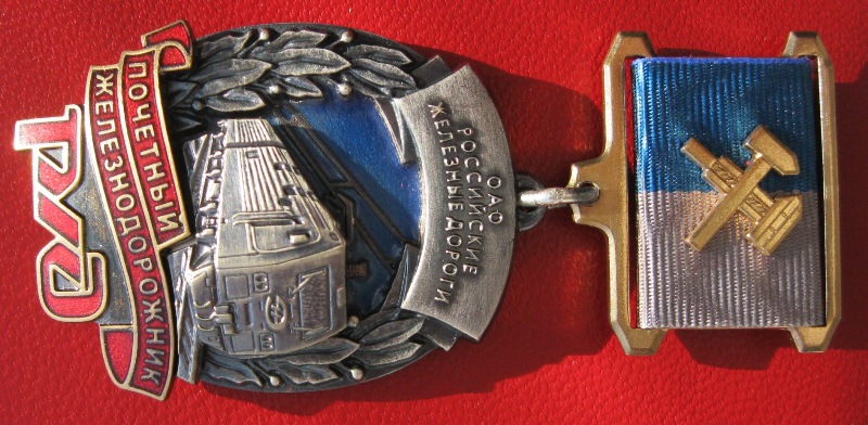 На "Почетном железнодорожнике" обр.2006г внизу имеет место быть эмблема ж/д транспорта, т.н. "птичка". С введением в 2010г новой форменной одежды ОАО "РЖД" от данной эмблемы отказалось в пользу P/D. Весьма любопытно, когда появится новый знак с новой символикой. Или может уже появился, никто не знает?