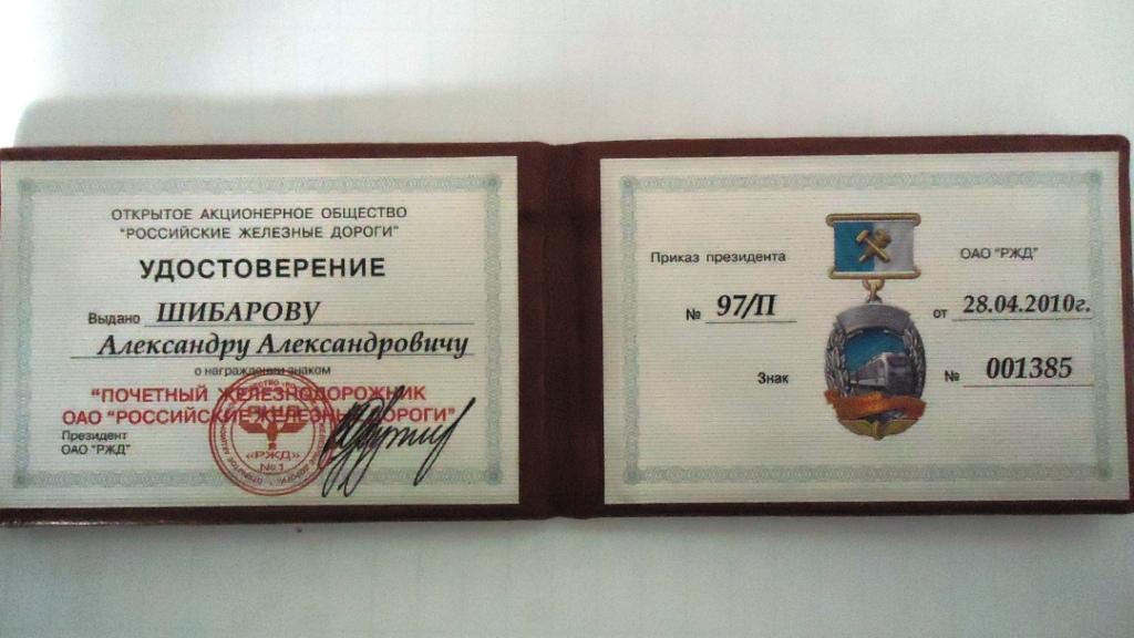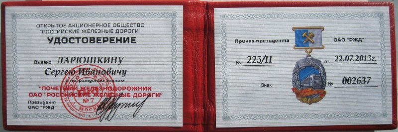 Вот знак №201424 и удостоверение к нему, подписанное Президентом ОАО РЖД Фадеевым