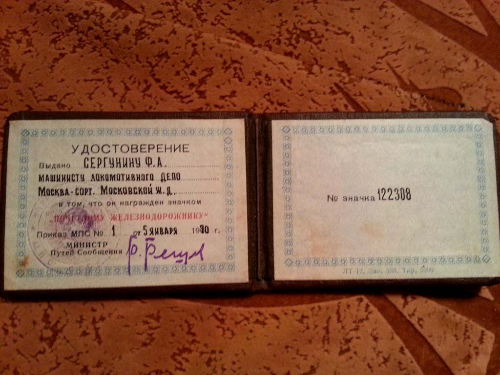 Есть фото знака № 179744 образца СССР, врученного приказом Министра Путей Сообщения РФ №420 от 08.12.1993 г.
