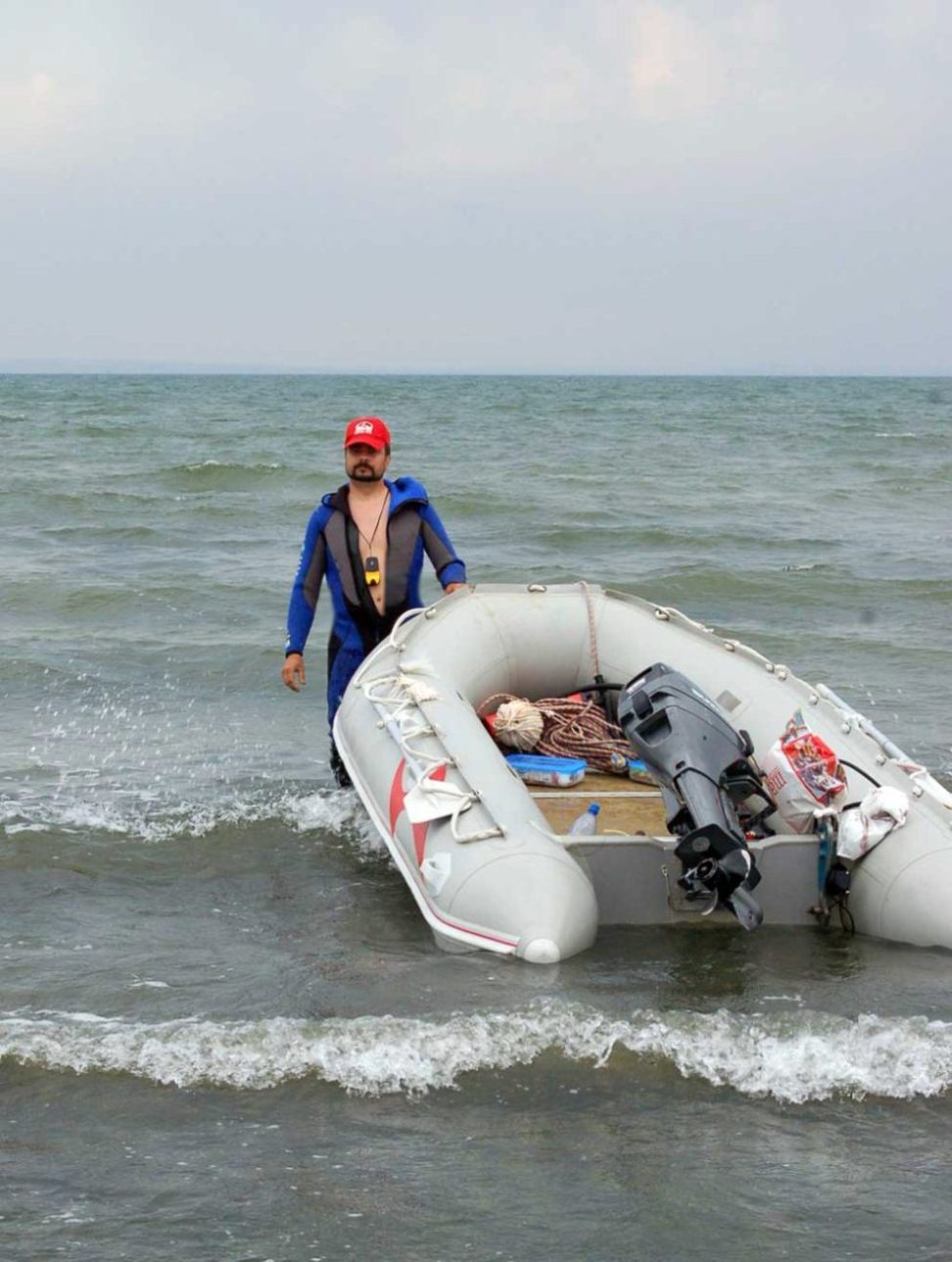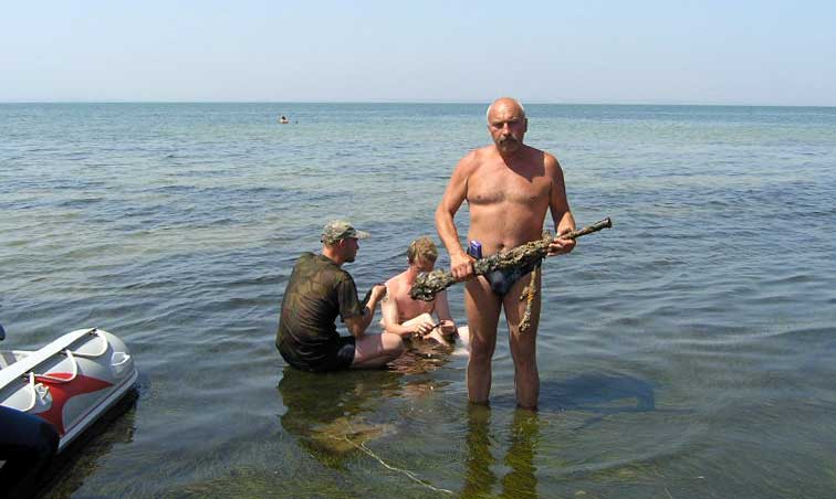 В первые несколько дней погода, действительно, не баловала , ибо волнение достигало до 4 баллов. Разумеется, это не останавливало энтузиастов, погружения проходили в штатном режиме, хотя видимость и оставляла желать лучшего, да и поиск с эхолотом был, мягко выражаясь, проблематичным. Лодка на волне сбивалась с взятого курса и приходилось многократно выходить на объект, ибо эхолот не мог дать чёткую зарисовку онного. И всё же, после многократных мытарств, точка появлялась на экране, место фиксировалось буйком, лодка вставала на якорь, ну а затем... группа аквалангистов с радостью покидала раскачивающуюся на волне лодку и уже рассекала ластами воды Керченского пролива. Техника безопасности погружений была под неусыпным вниманием руководителя экспедиции Станислава Долгова. :diver: