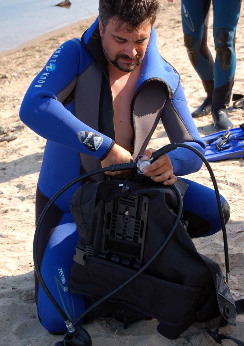 6 августа 2007 г уже был развёрнут лагерь в районе мыса Тузла. Оборудование проверено. Компрессор и акваланги "доложили" о своей готовности. Аквалангисты рвутся в бой, но ... волнение на море в первый день экспедиции, несколько меняет планы. Все с нетерпением ждут "спокойной воды". :diver: