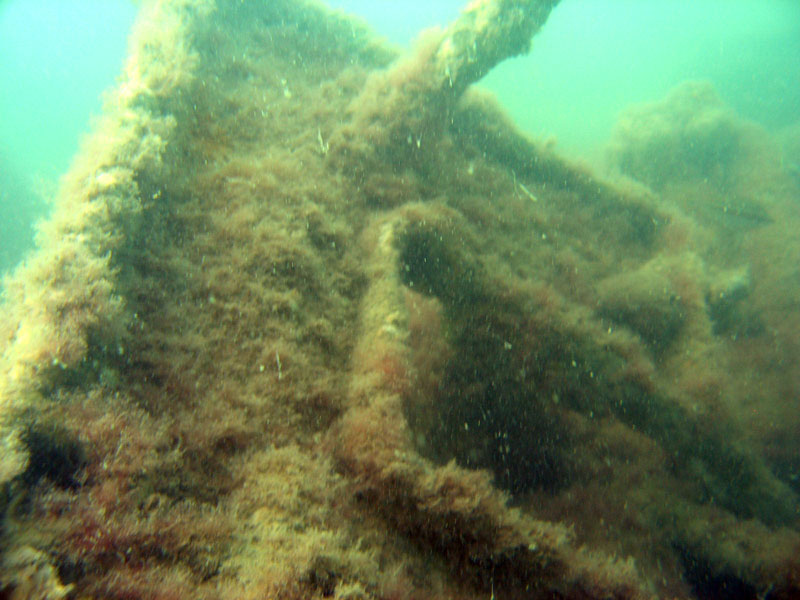 При осмотре, на дне обнаруживается скопление металлических конструкций, среди которых заметно выделяется вертикально стоящий, обросший ракушками и донными наслоениями, резко коррозированный судовой двигатель.