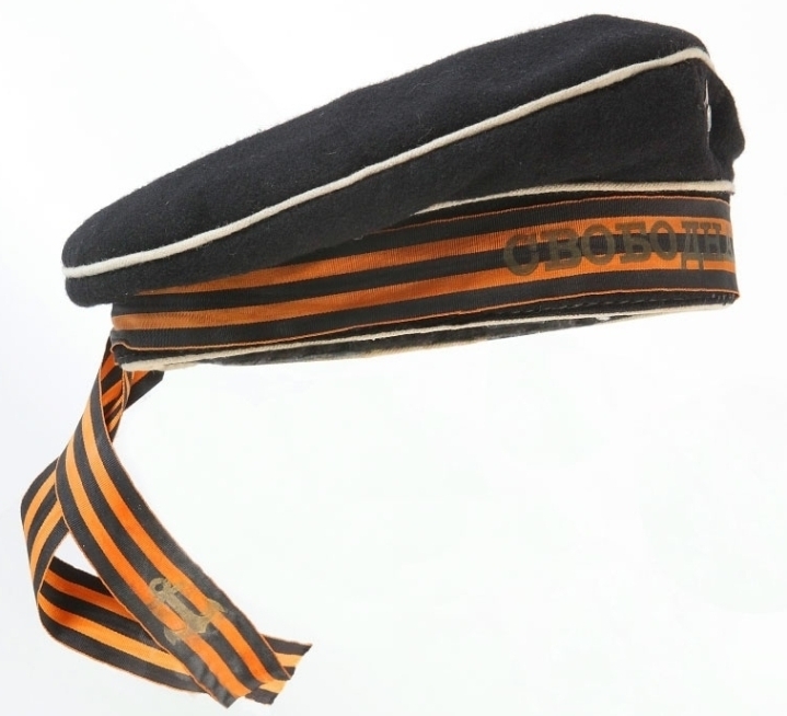 Вокруг околыша по всей длине проходит шелковая муаровая двухцветная георгиевская лента, поверх которой золотистыми крупными буквами нанесено название судна - "Свободная Россия".