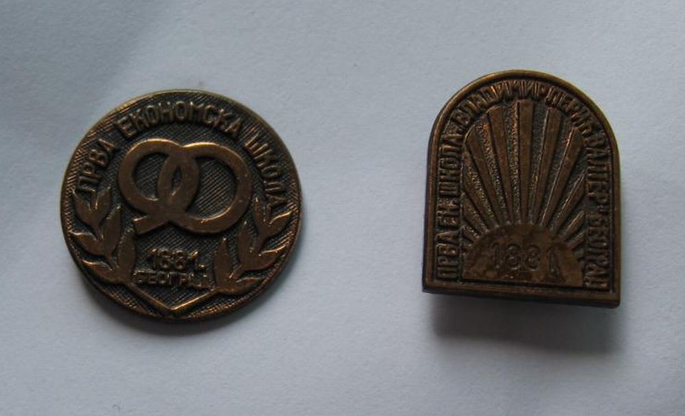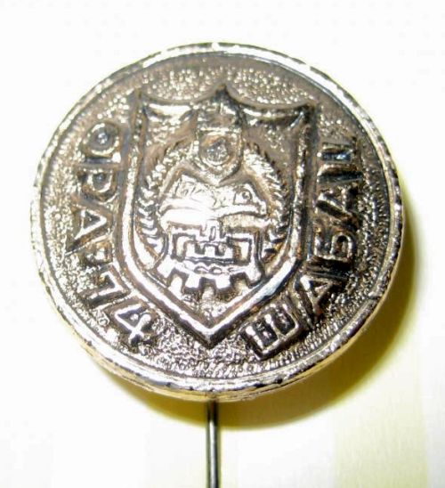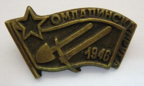 Знак, посвященный молодежной трудовой акции по строительству Нового Белграда, самого первого этапа 1948 г., с надписью на латинице, из бронзы, с частично сохранившимся серебрением. Разновидность по штампу.