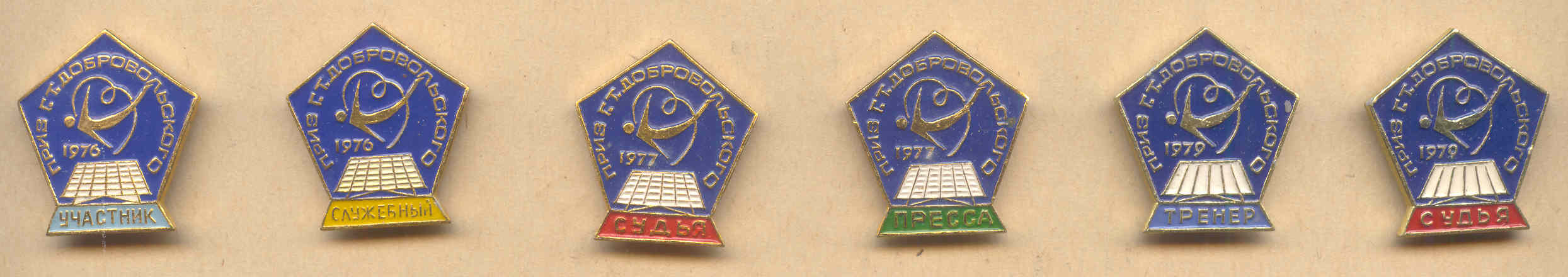 Хорошая подборка. К верхнему ряду можно добавить еще аналогичные знаки 1978г. и 1980г. Ну, и соответственно, для каждого года все надписи (судья, служебный, участник, тренер, пресса). Вероятно, те же варианты надписей и для нижнего ряда. У меня есть "Минск-74" - служебный, и "Ленинград-75" - участник и тренер.