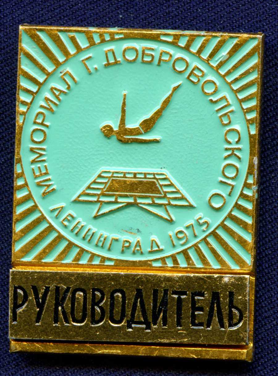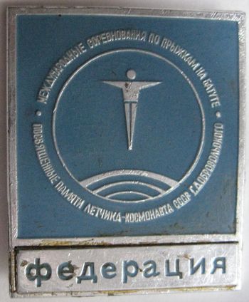 Добавлю ещё один значок турнира по прыжкам на батуте , посвящённого памяти Г.Т.Добровольского "ПРЕССА" (XIX.6 по Ильинскому)