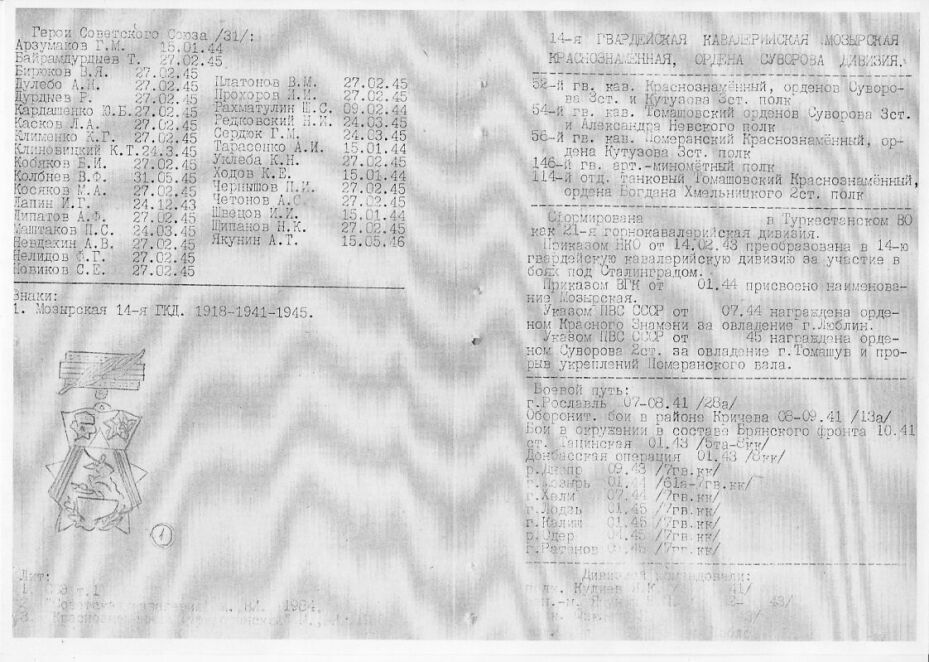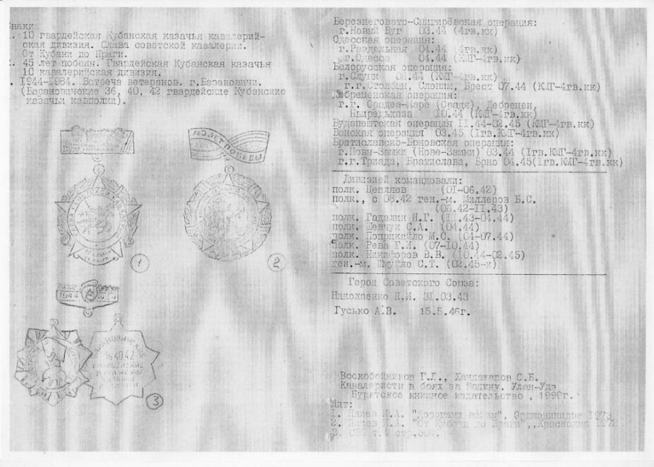 На этом каталог Б.Меньшова заканчивается. Выложен "по посьбе трудящихся".Для тех, кто интересуется историей кавалерии в период Великой Отечественной войны рекомендую книгу Г.Воскобойникова и С.Хандажапова "Кавлеристы в боях за родину" , Улан Удэ, Бурятское книжное издательство, 1990 год. Оглавление прилагается