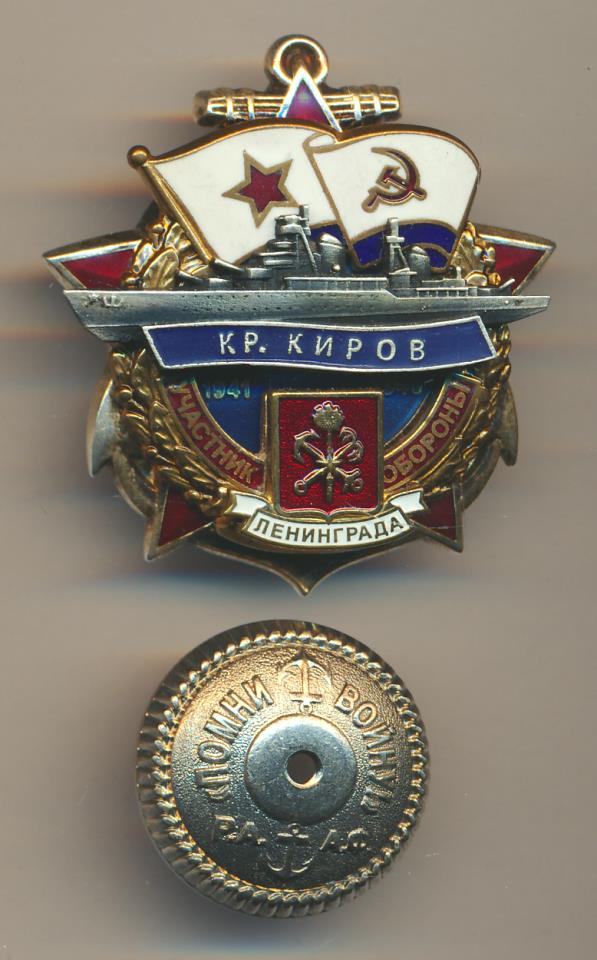 Уважаемый коллега! Вы совершенно правильно сделали вторично представив знак крейсера "Киров" - участника обороны Ленинграда, причём с демонстрацией реверса. Дело в том, что этот знак имеет два исполнения, отличающиеся по типу крепления: винт (как у Вашего знака) и булавочное. К сожалению Ваш предшественник не представил реверс знака и остаётся только гадать к какому типу знака относится выставленный им знак. По этой причине я представлю вариант знака с булавочным креплением и, тем самым, полностью исчерпаю вопрос об этом значке. :hi: