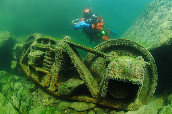 При одном из погружений в южной акватории озера на склоне были обнаружены фрагменты железнодорожных вагонов, предположительно времён Гражданской войны. Несмотря на высказывания экспертов, что в начале XX века неоднократно практиковалось в зимнее время укладывание рельсовых путей по льду озера и бывали случаи ухода вагонов под лёд, журналисты, падкие на сенсации, тут же решили, что всё "давно забытое прошлое" должно вернуться из небытия, как " вновь воскресшее", ну и останки ж/д состава, разумеется, тут же были сопоставлены с отступающими войсками Колчака. Ну, а там где адм.А.В.Колчак, там соответственно, и его "золотой эшелон" :diver: