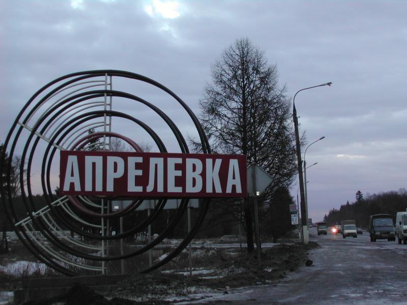 Еще один, но уже бывший, знак-указатель "Апрелевка", находившийся в специально разбитом для него сквере на пересечении Апрелевской улицы и Киевского шоссе, который ныне ликвидирован в связи с проложением на его месте дополнительной дороги для нового съезда с "Киевки" и надземного пешеходного перехода через "Киевку". Обратите внимание на мало кому известный бывший герб Апрелевки: по имеющимся непроверенным сведениям, существует только крайне малотиражный значок с таким гербом, причем значок, как говорят, внешне смахивает на самопал.