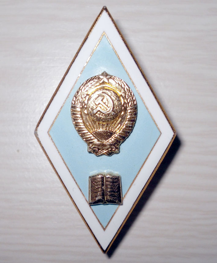1. Нагрудный академический знак для лиц, окончивших советские высшие учебные заведения, имеет форму слегка выпуклого ромба, покрытого эмалью цвета в зависимости от типа высшего учебного заведения, причем на краю ромба расположены белые эмалевые полоски, окаймленные золотистыми бортиками. В верхней части знака на фоне эмали помещается накладное золотистого цвета изображение герба Советского Союза.