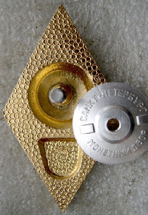 На оборотной стороне знака имеется винт с гайкой для прикрепления знака к одежде.