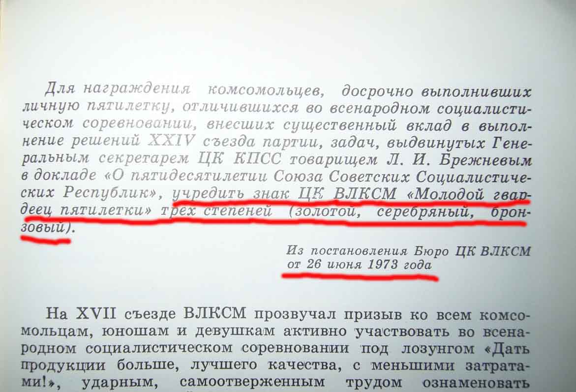Термин из аналогии с юридическими науками. Основное постановление касалось самих знаков. Их утверждения. А я говорю о частном случае - постановлении о конкретном награждении конкретных людей. Упоминаемое в книге (на которое сослались Вы) постановление было первым, но далеко не последним частным случаем, учитывая, что знаком первой степени награждает только ЦК.Chinovnik писал(а) :Что значит постановление ЦК ВЛКСМ - частное.